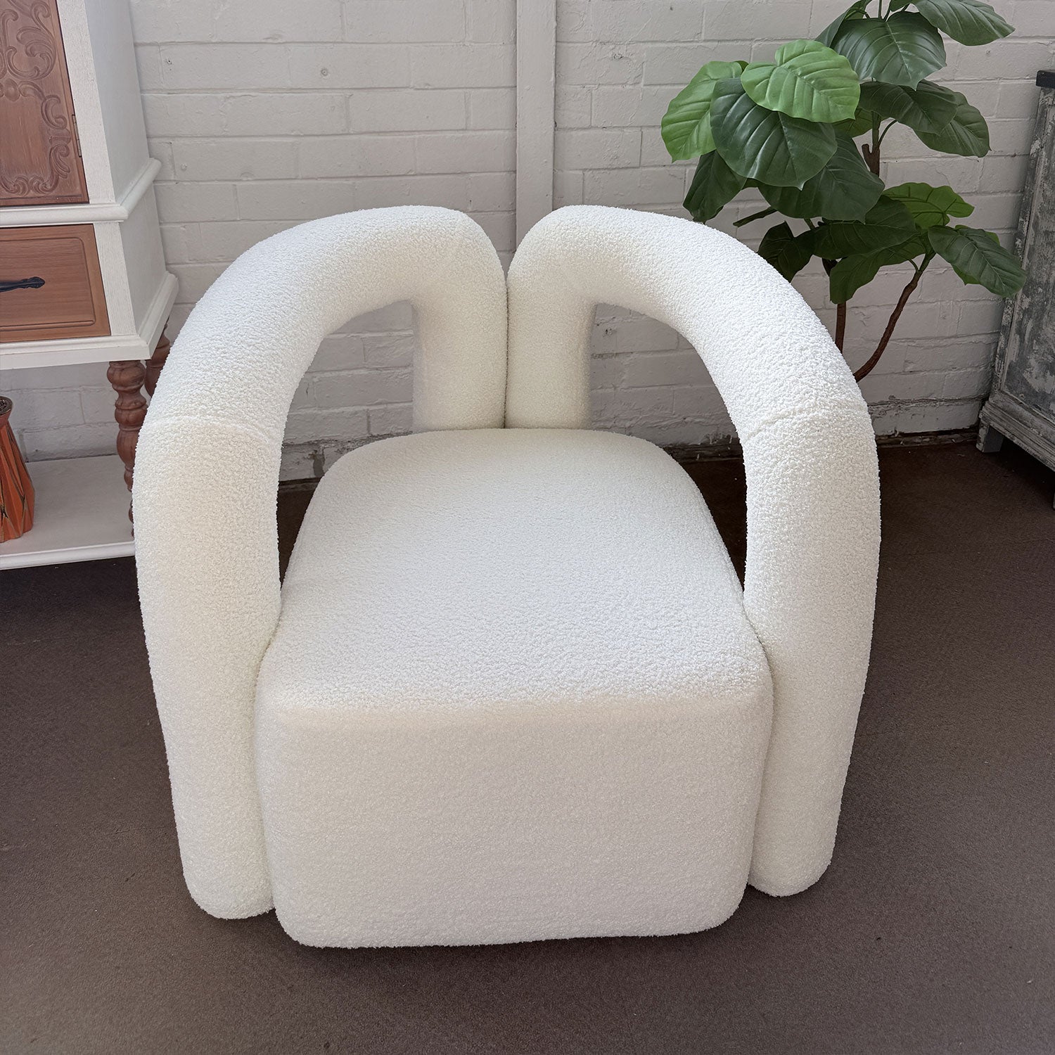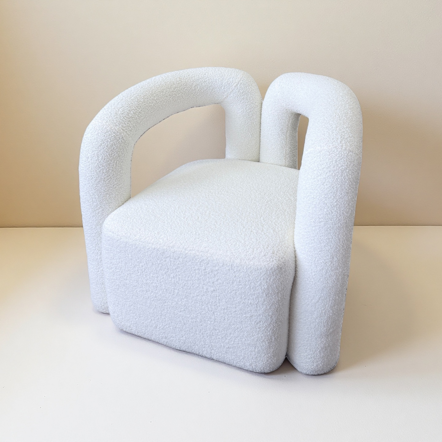 ✔️ Design: Bold yet minimal – the chunky square seat pairs with rounded arch arms for a playful, architectural look.