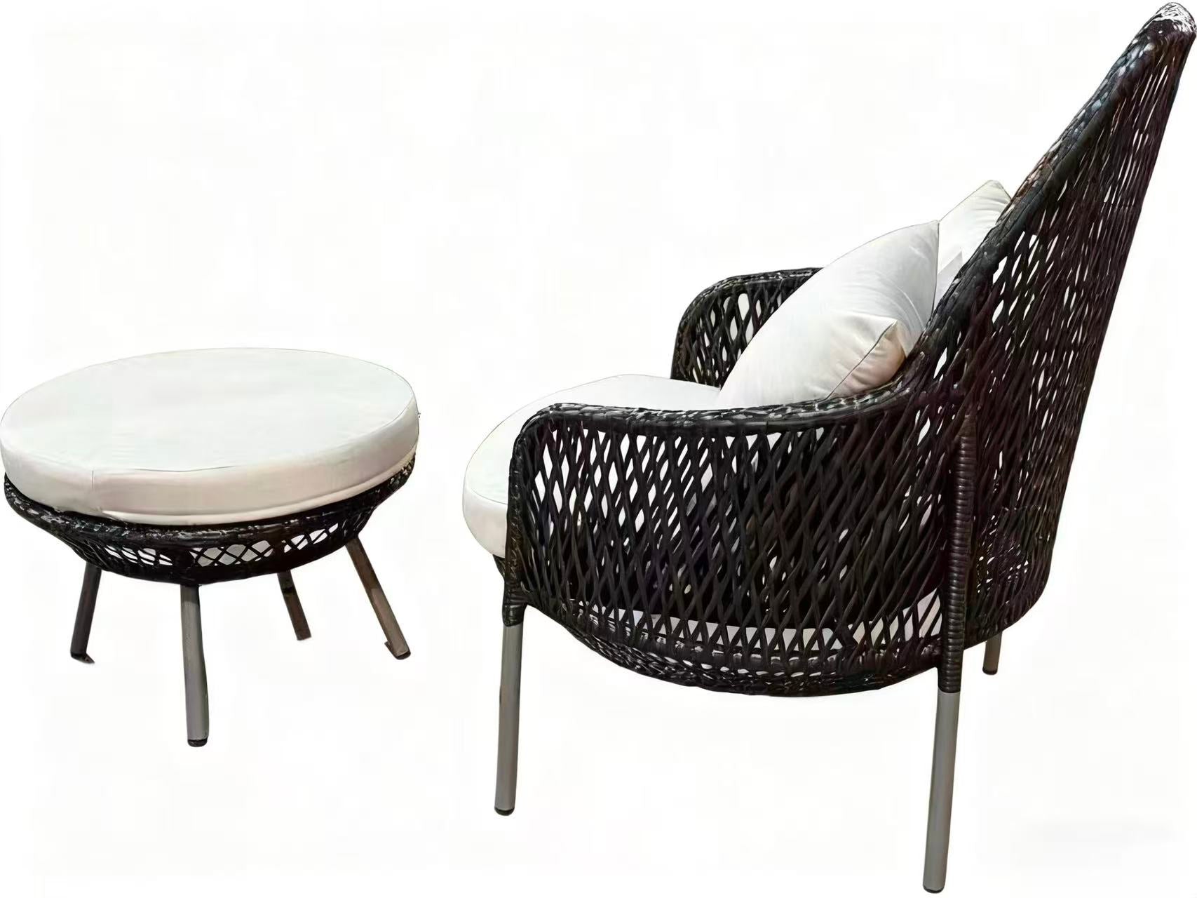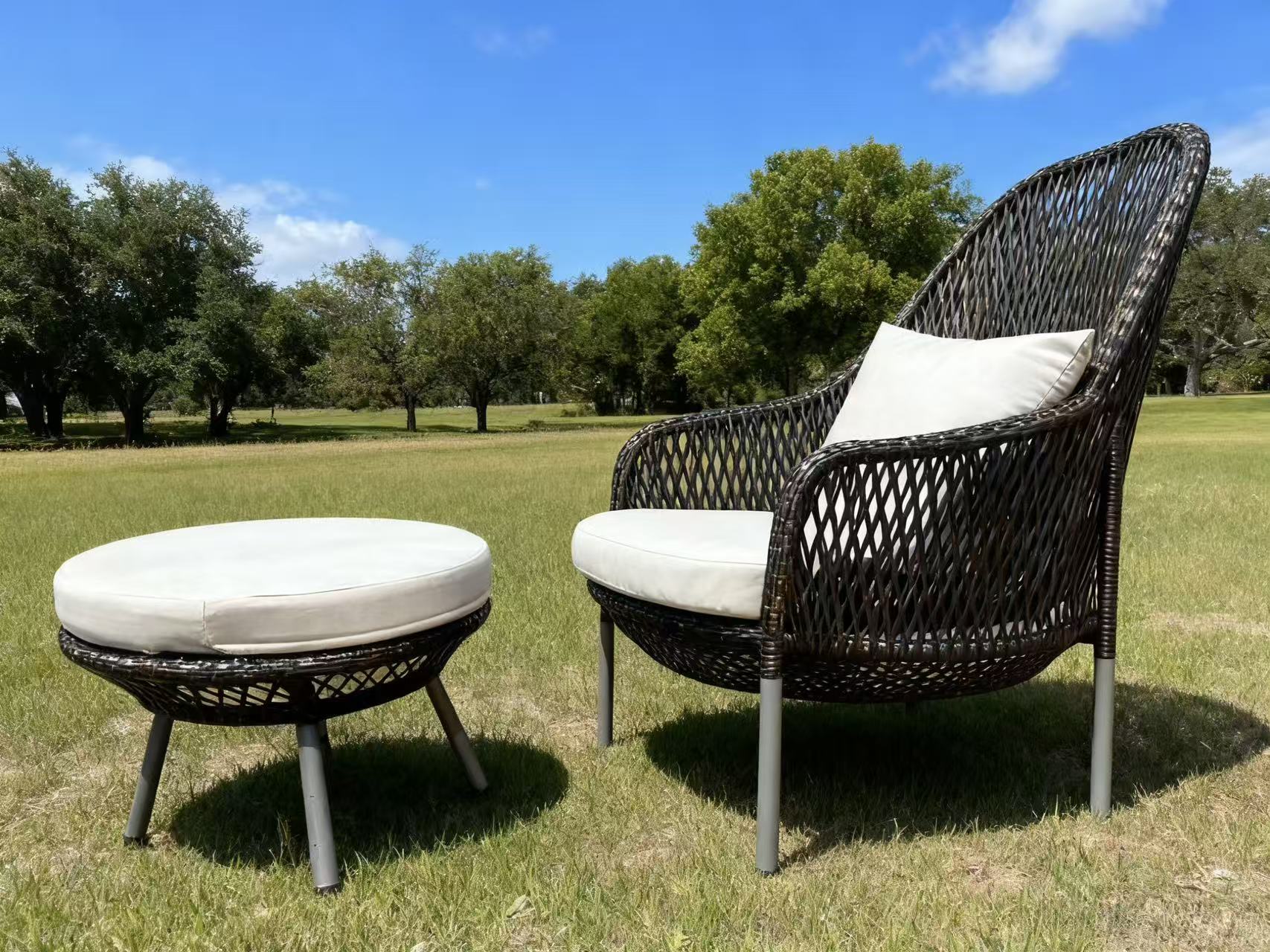 This stylish duo features a high-back single chair and a round ottoman, crafted with a sleek woven frame and finished with plush SunNova fabric cushions.